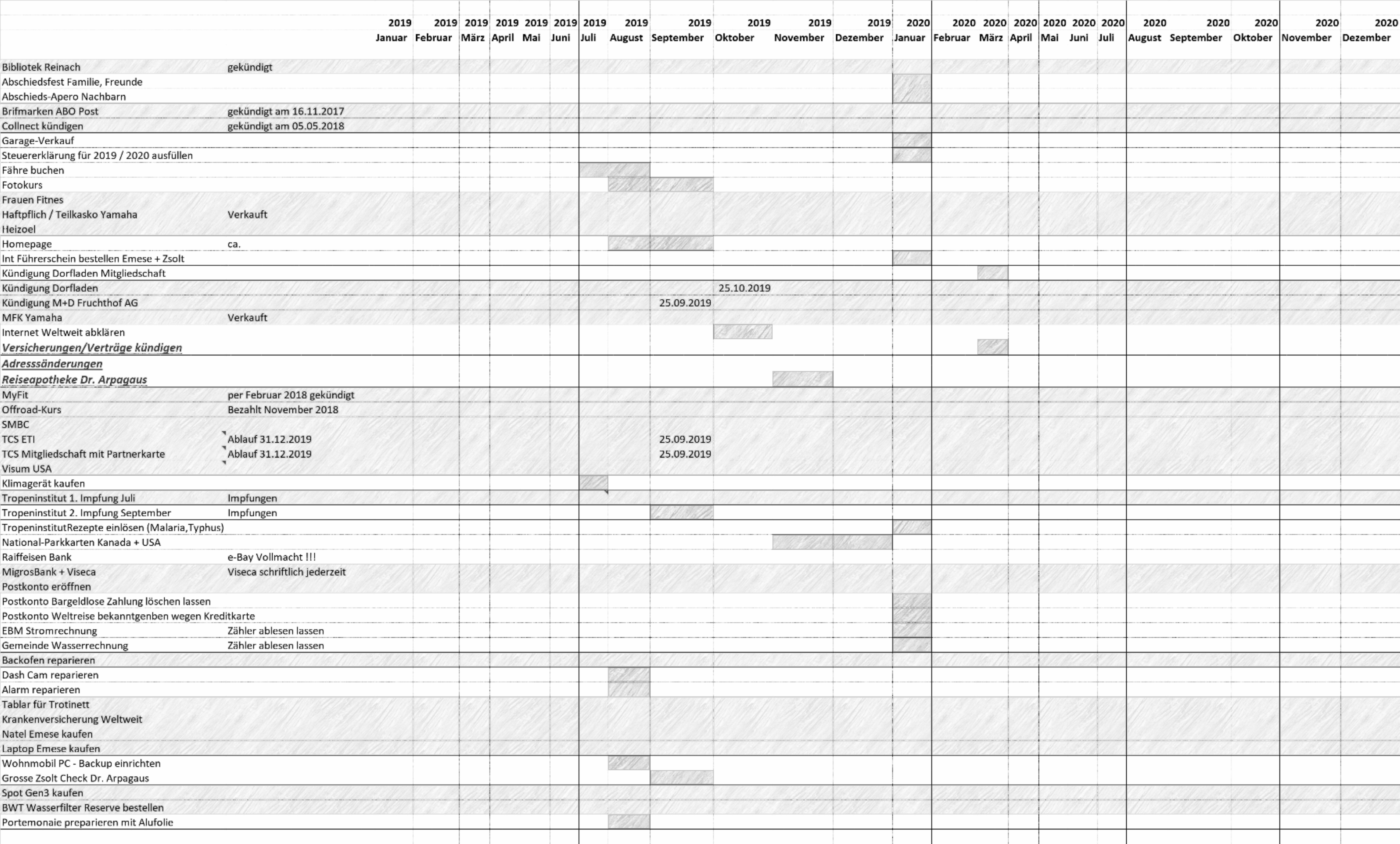 Die ganze Planung haben wir in einem Masterplan aufgezeichnet. Um am Ende keine bürokratische Massnahmne oder wichtige Dokumente zu vergessen, die verbliebene Zeit optimal einteilen zu können, ist eine konkrete To-Do-Listeiste mit einer Zeiteinteilung entstanden.